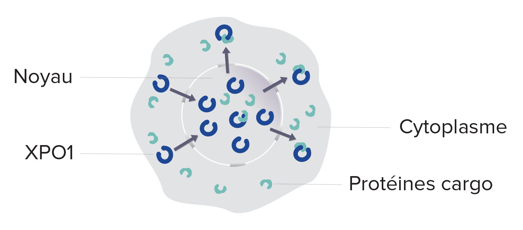 - L'exportation nucléaire des protéines cargo, dont les protéines suppressives de tumeurs (PST), dans le cytoplasme s'intensifie1,3-6.